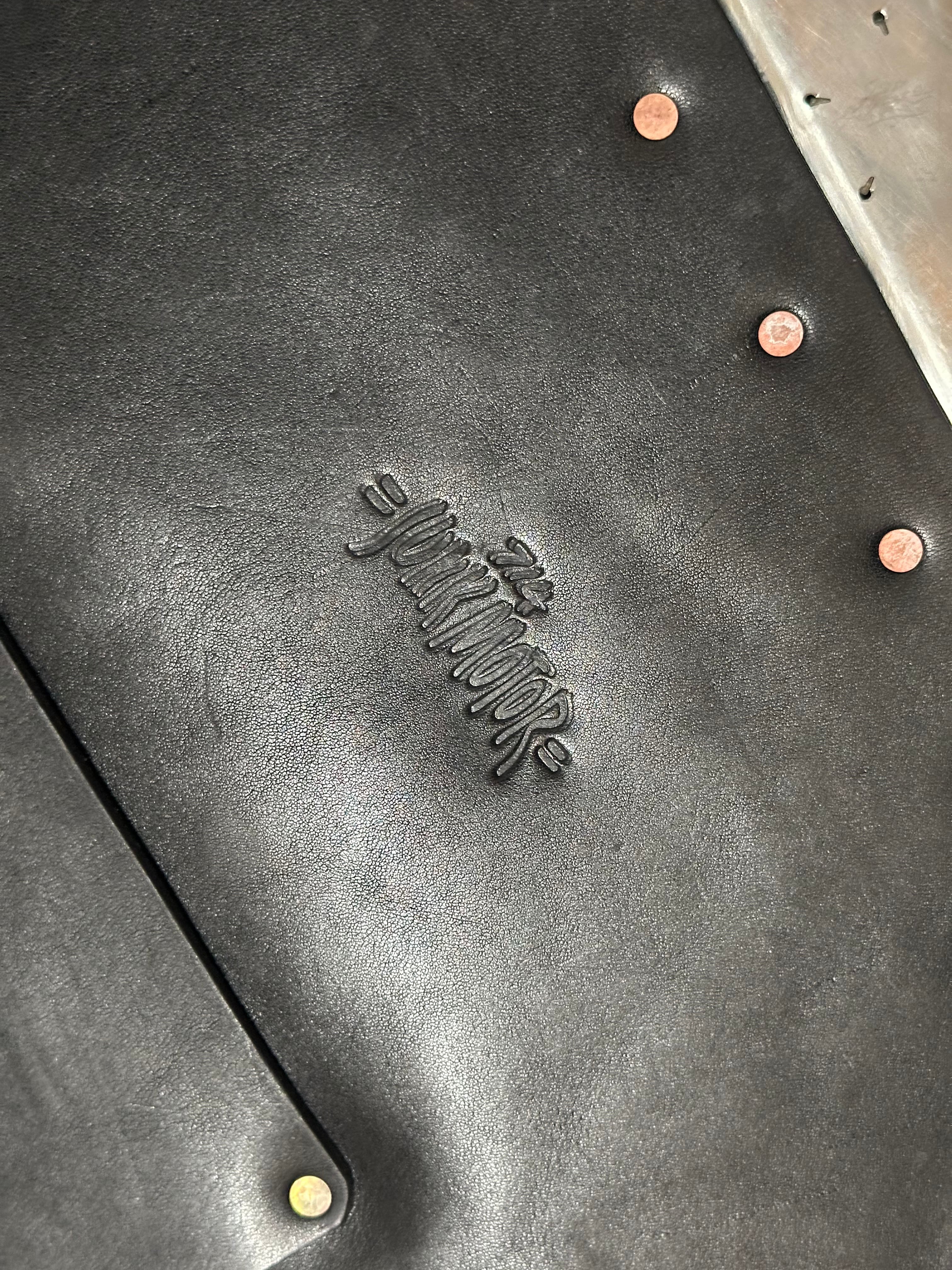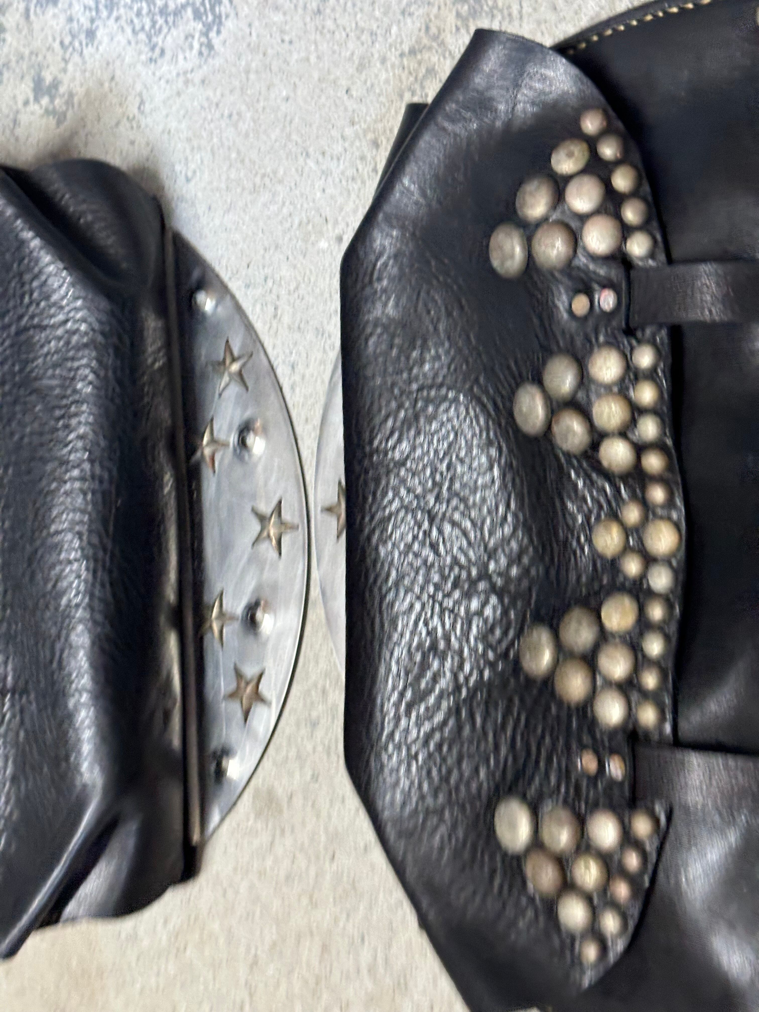 14オンスの分厚いシボ革を丁寧に手縫いで仕上げました一点物の左右ペアで同じ物はありません。 ビンテージスタッズを贅沢に使った最新作です。