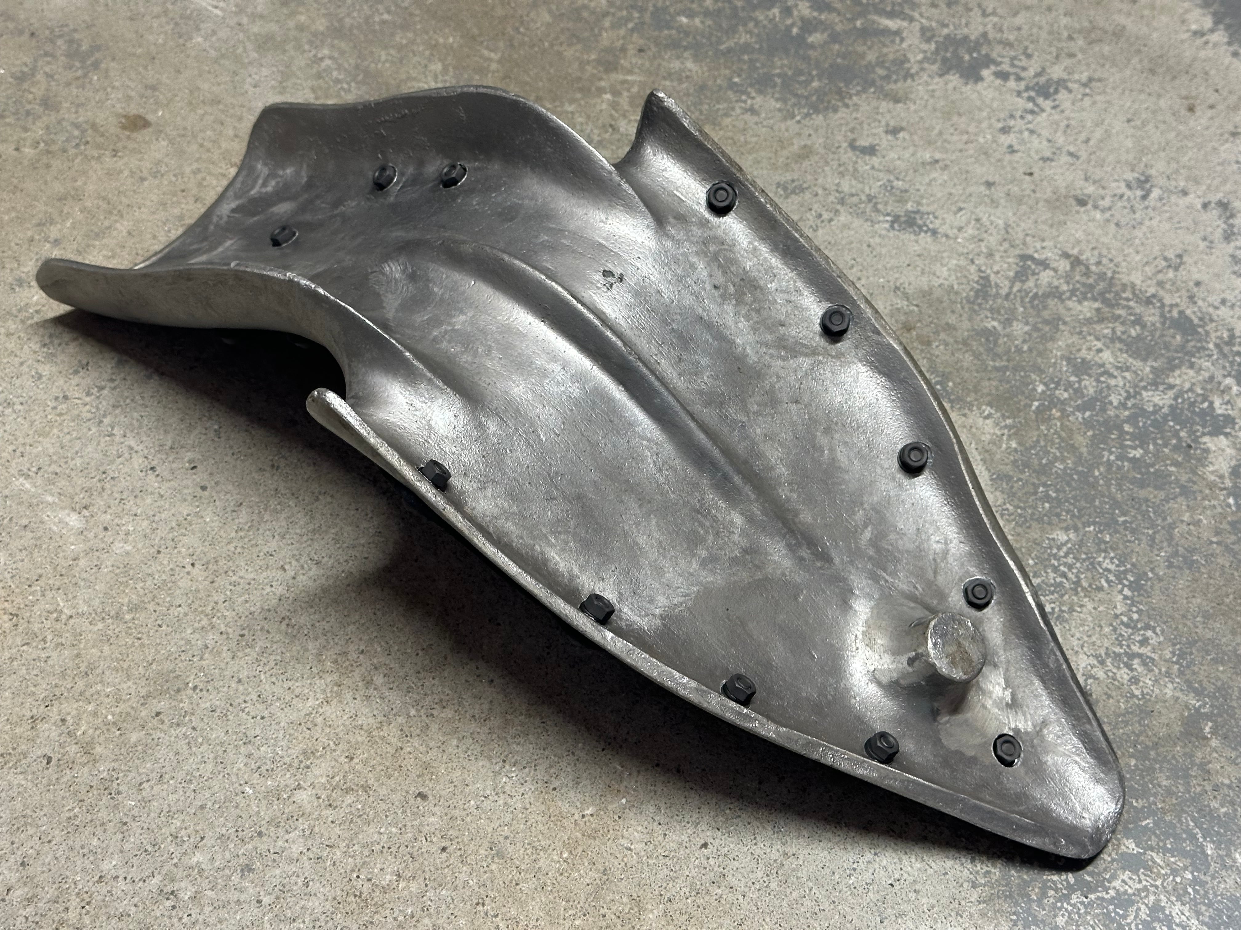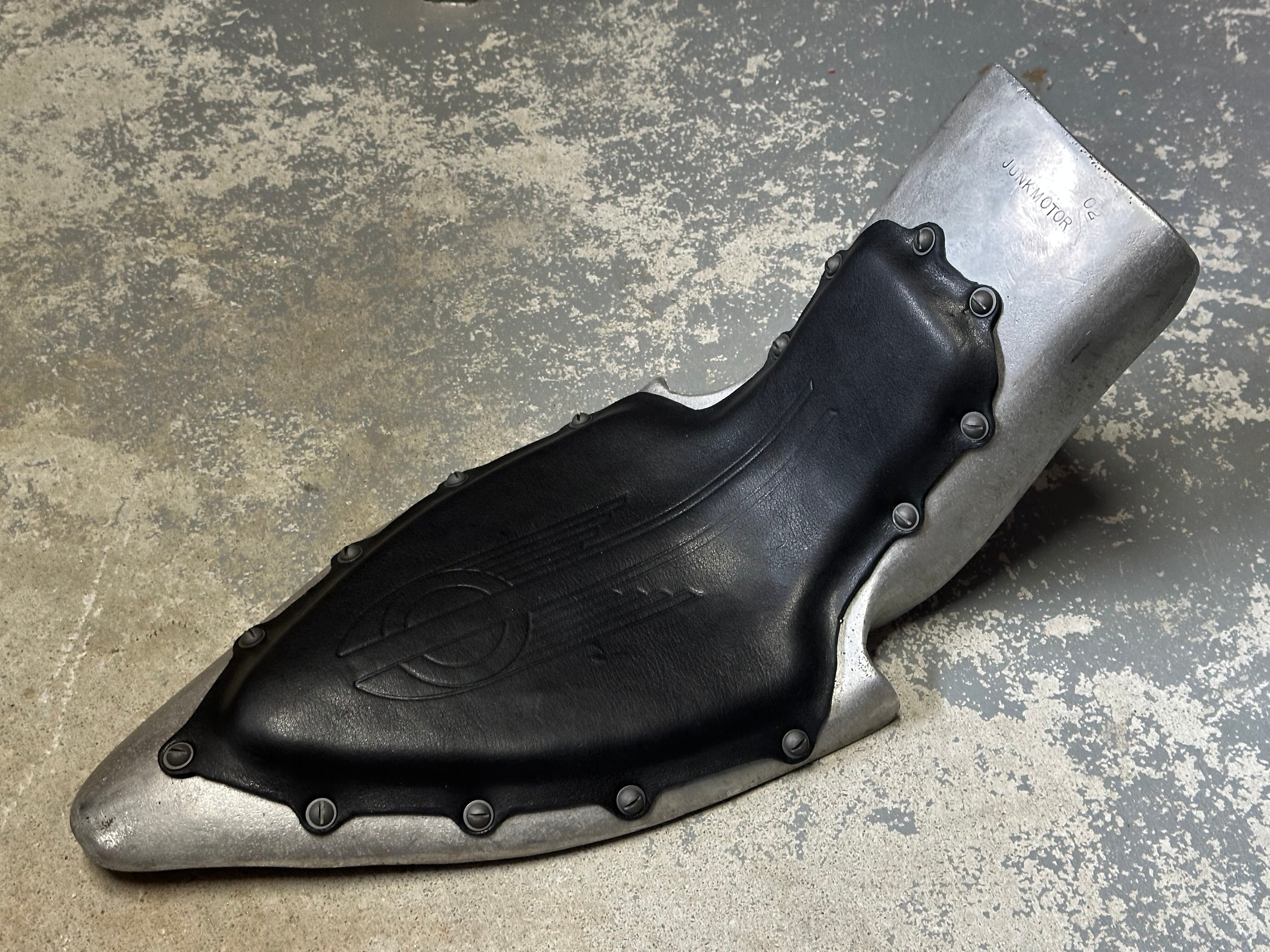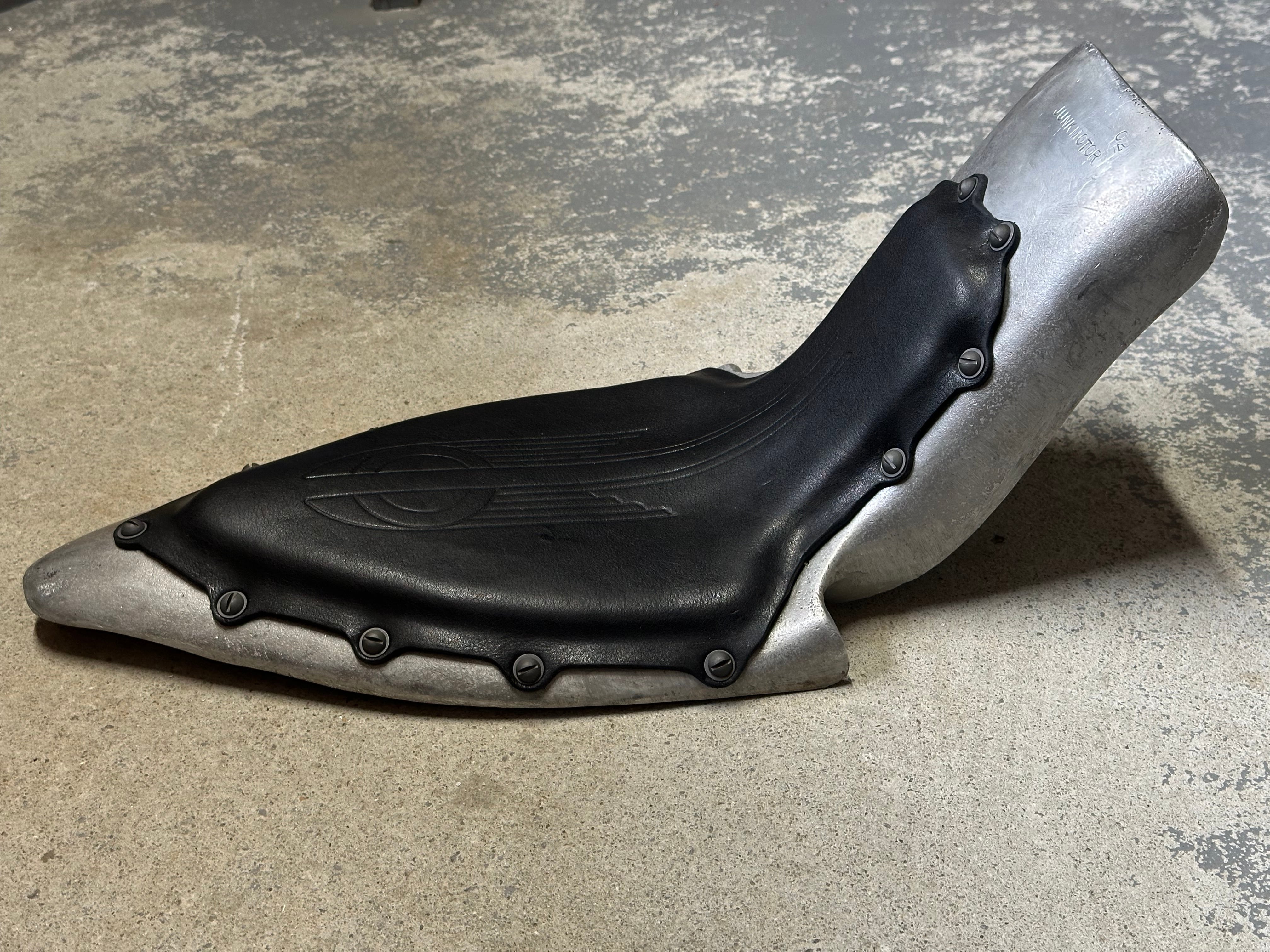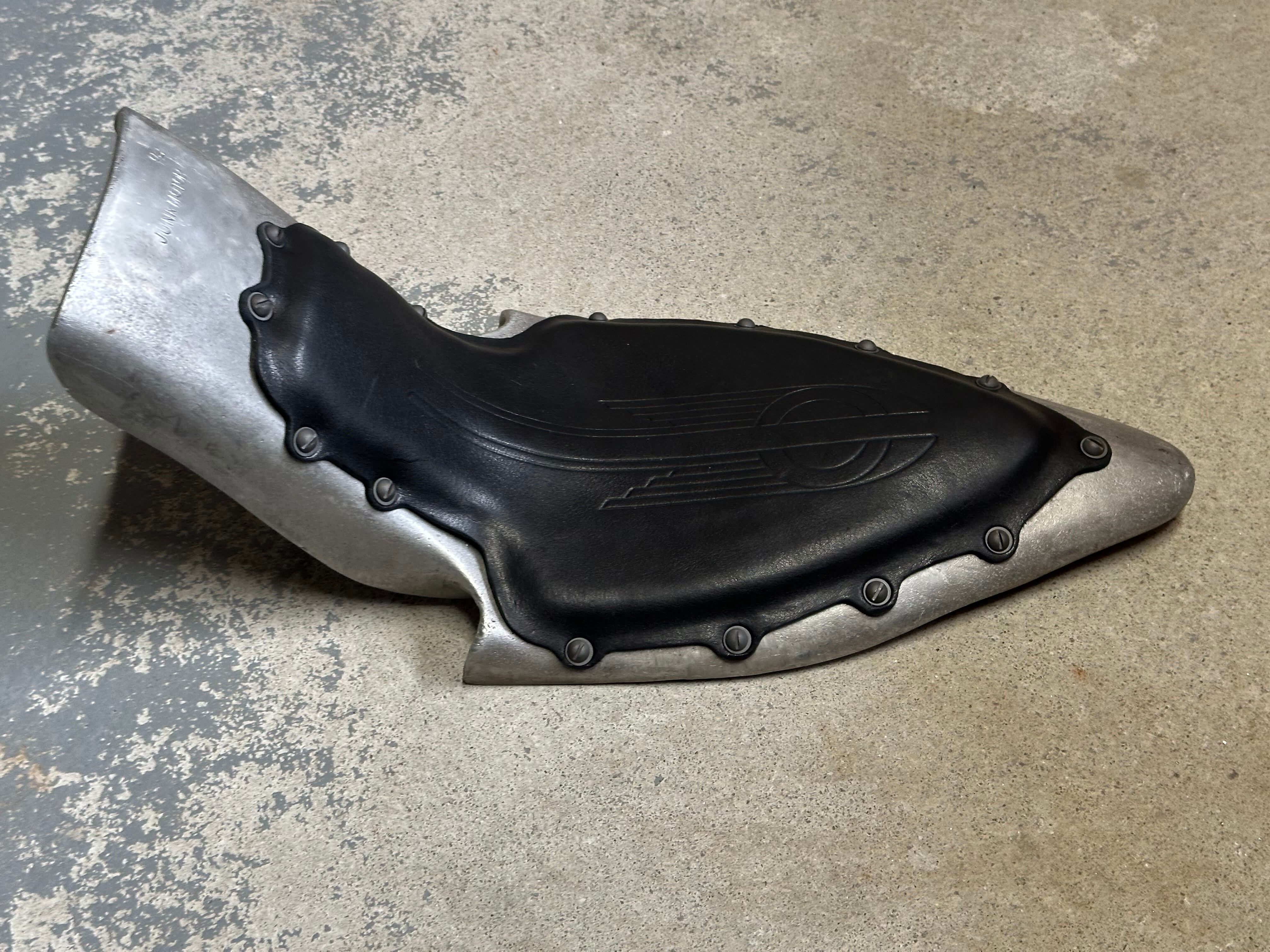 アルミの鋳物で製作したリヤフェンダーとシート一が一体になったシートフェンダー。 純正フレームにジャストフィットします。 薄めのラバーに極厚16オンス黒革をマイナスネジで貼りました一点物です。