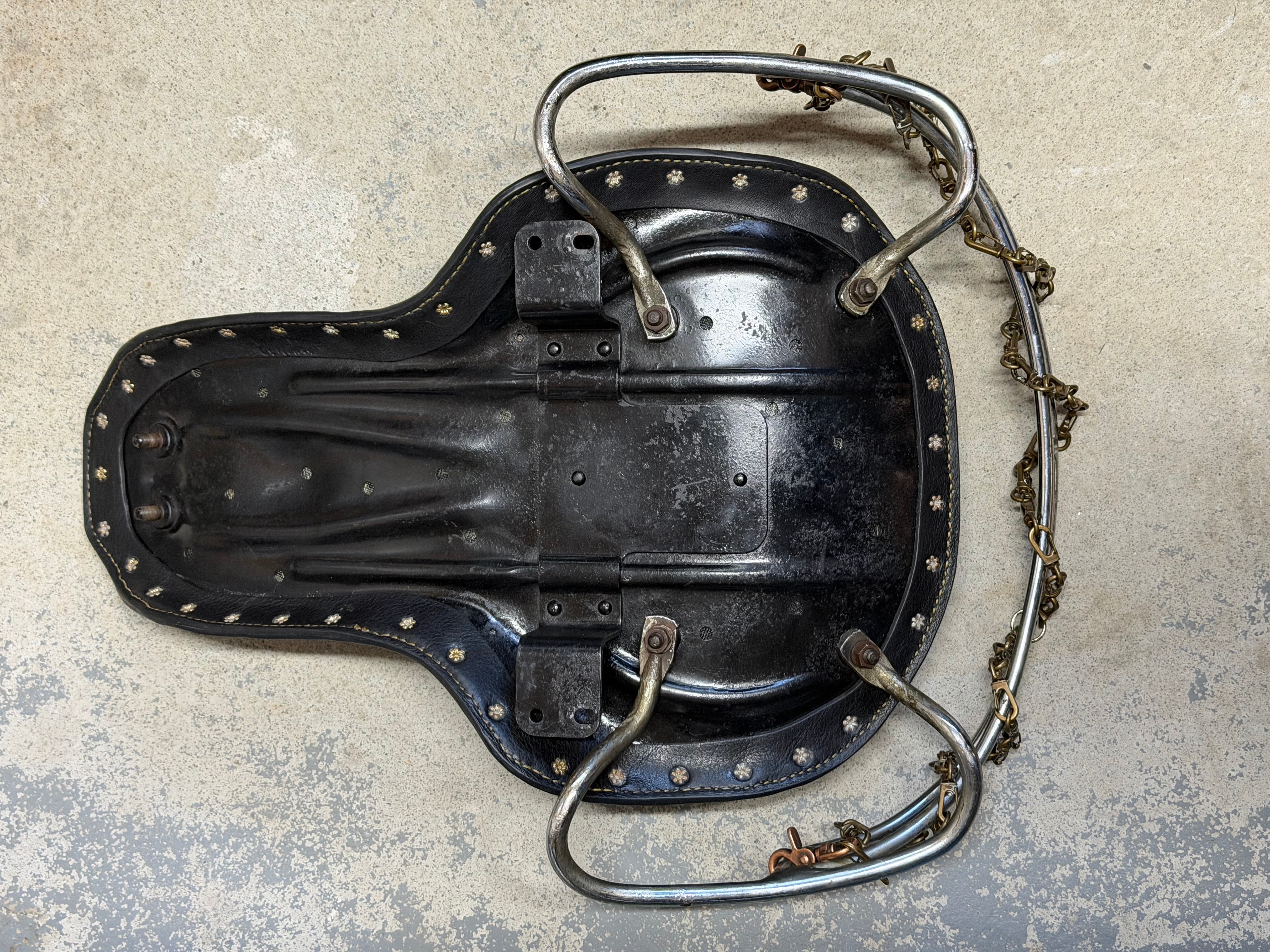 純正のシートパンと珍しい型の純正グラブレールにビンテージチェーン、ヘビーデューティ14オンスの厚革にスピードボールをあしらった一点物です、個人的に好きな作品です。