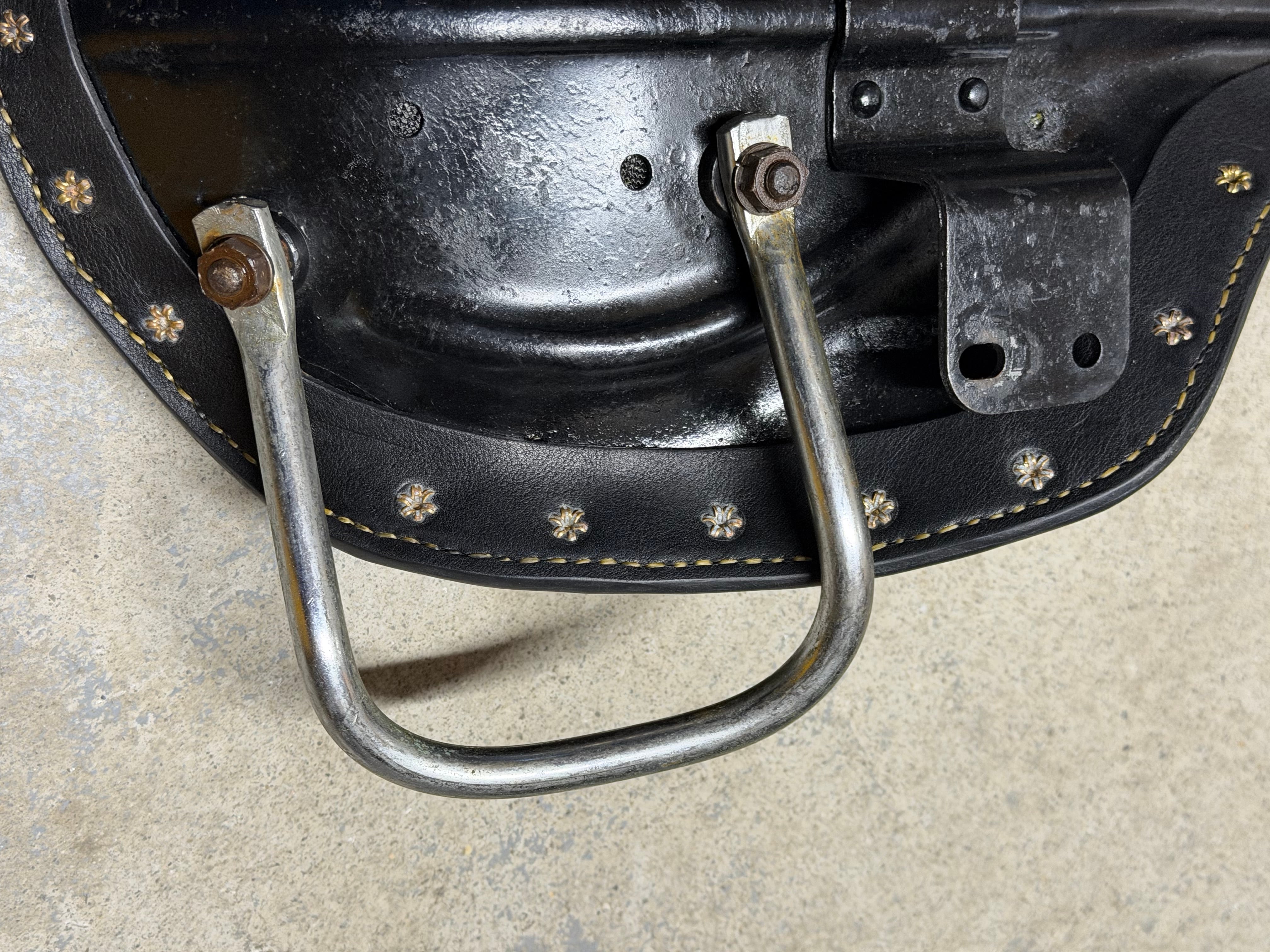 14オンスの分厚い本革を手縫いで仕上げました、当時物の純正グラブレール、スピードボールのエンボス加工、一点物のバディシートです。