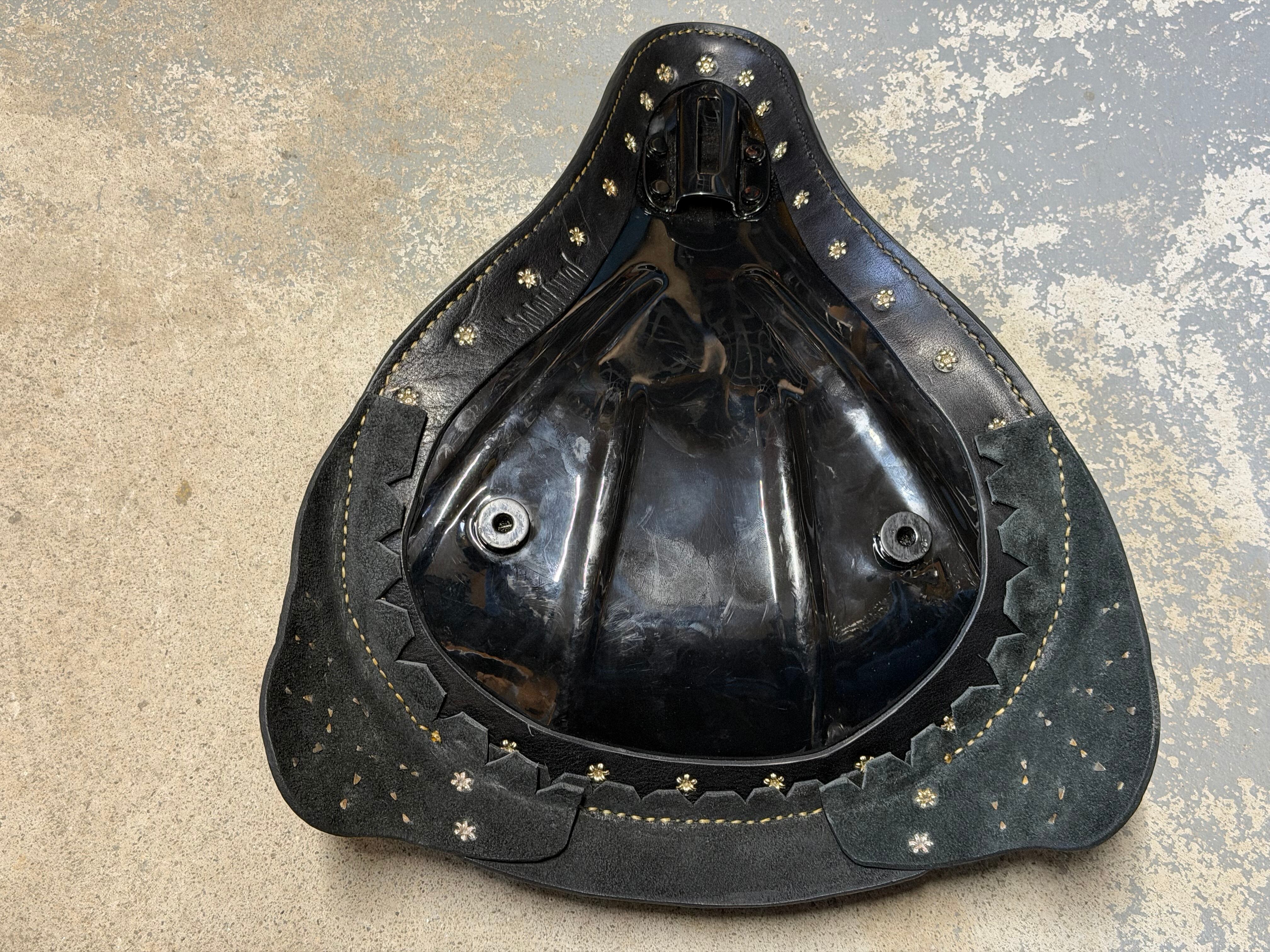 Kシリーズのシートパンをナローにカット、ノーズとスカートにはビンテージスタッズをあしらった一点物です。