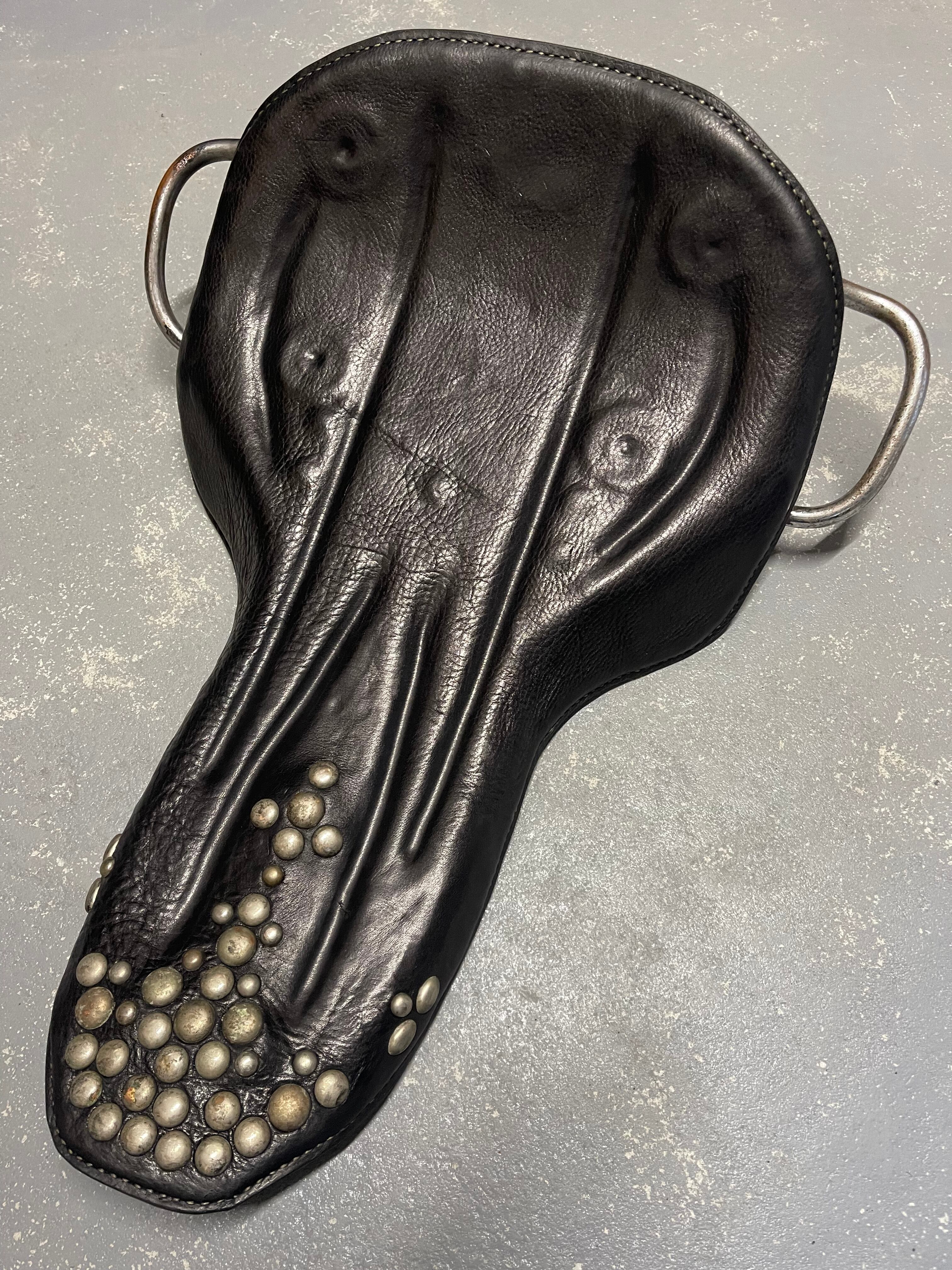 純正のシートパンに分厚い革だけで貼ったハードコアな一点モノです、ノーズには贅沢にビンテージスタッズをあしらいました。