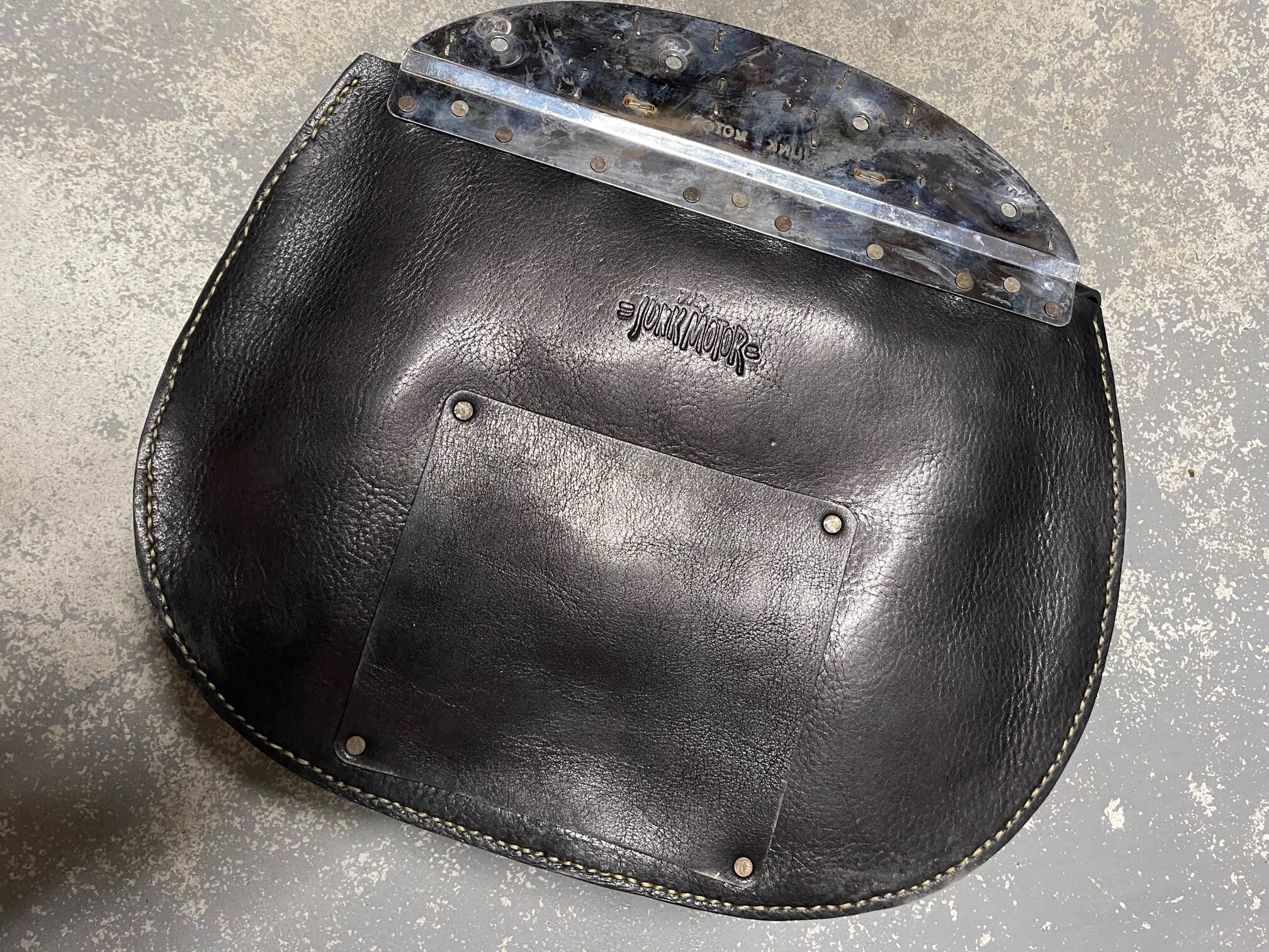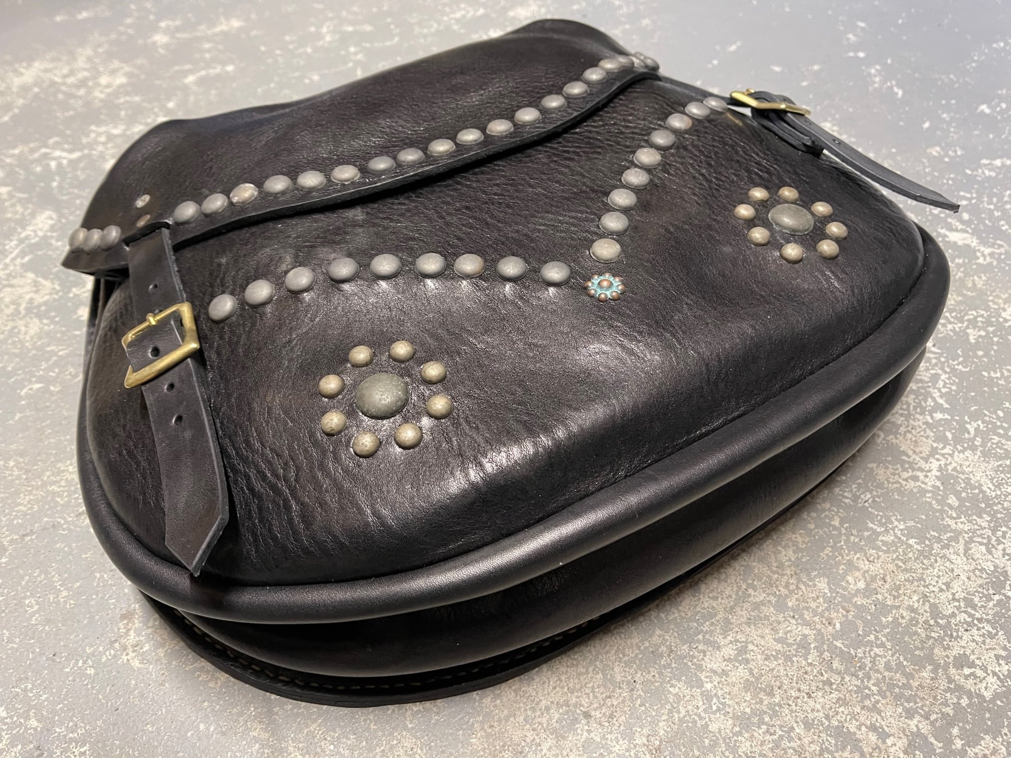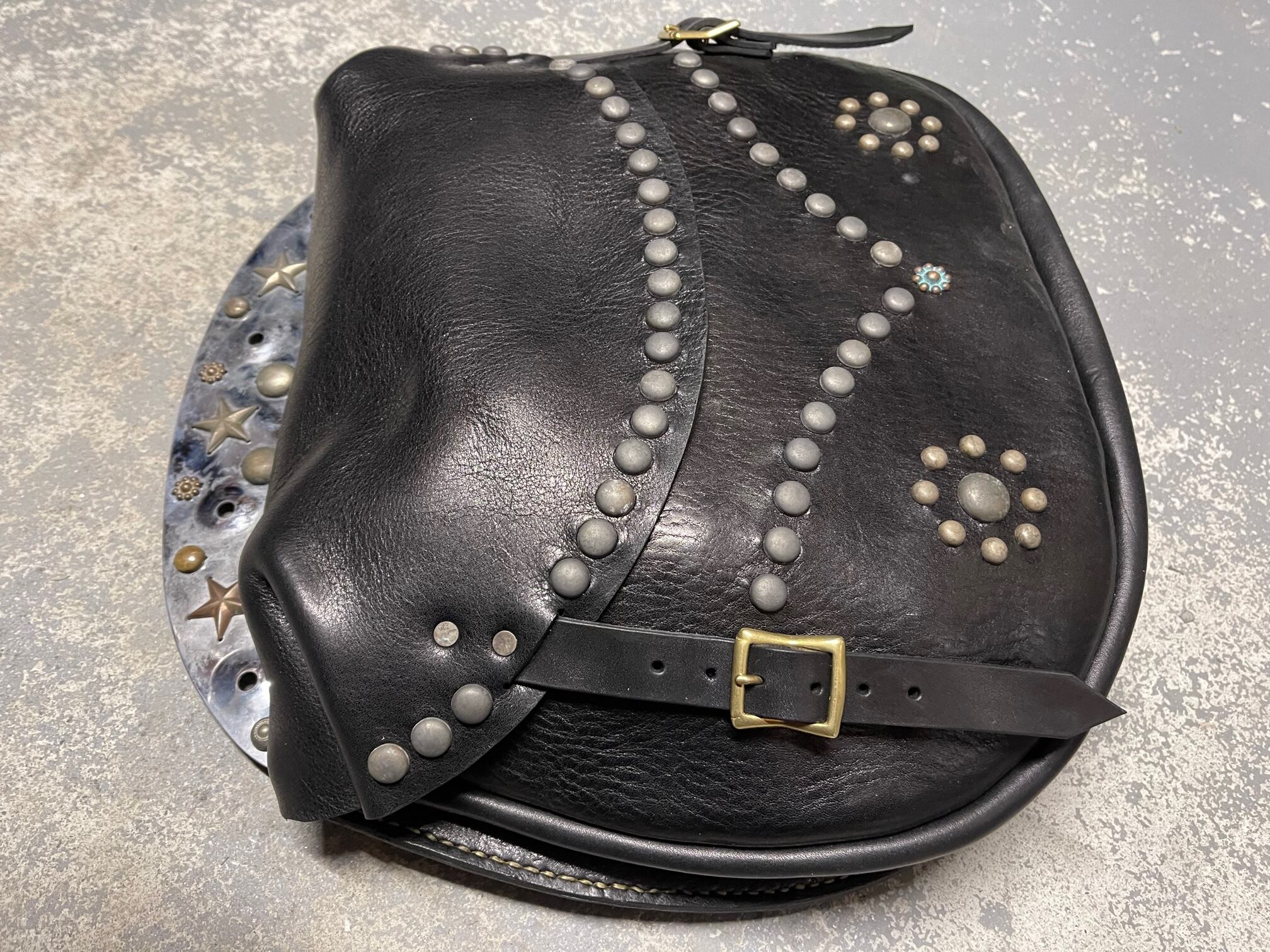 分厚い14ozHeavy-Dutyレザーを使って丁寧に手縫いで仕上げた一点物です、ビンテージスタッズをマウントプレートにも奢りました、マチを14cm取りましたので容量もあり何でも入ります。純正のロックタイトをイメージして製作しました自信作です。