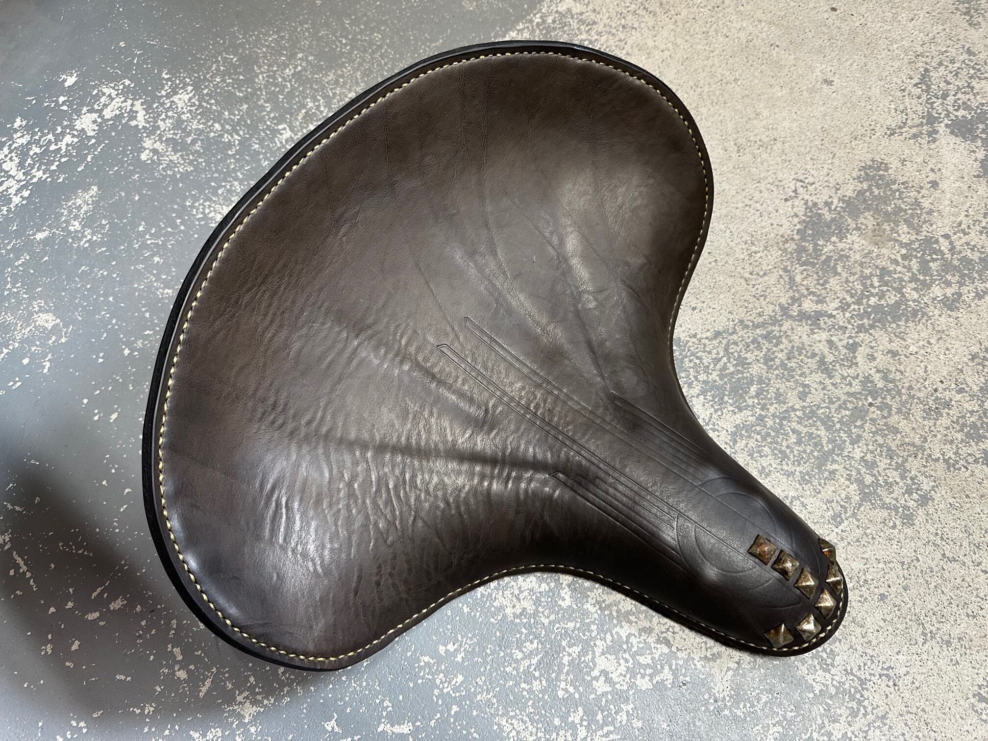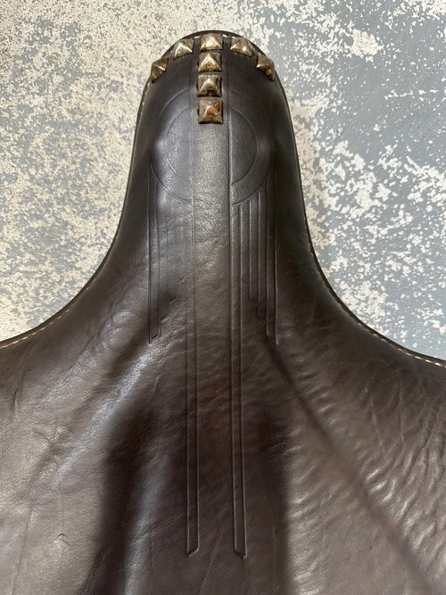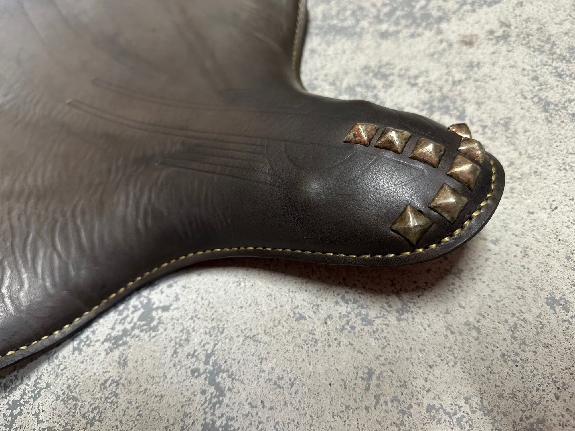 16oz、約5ミリ厚の墨色ヘビーデューティーレザーで製作した一点物です、ノーズにビンテージスタッズを奢りました、お早めにどうぞ。