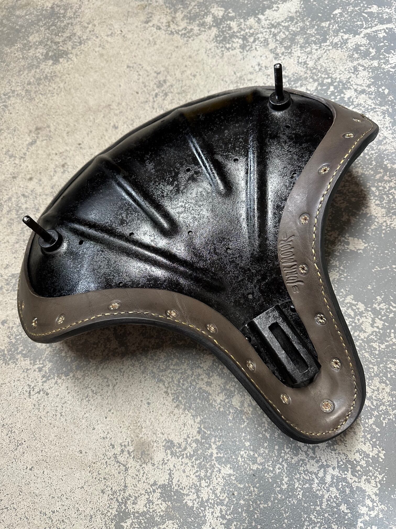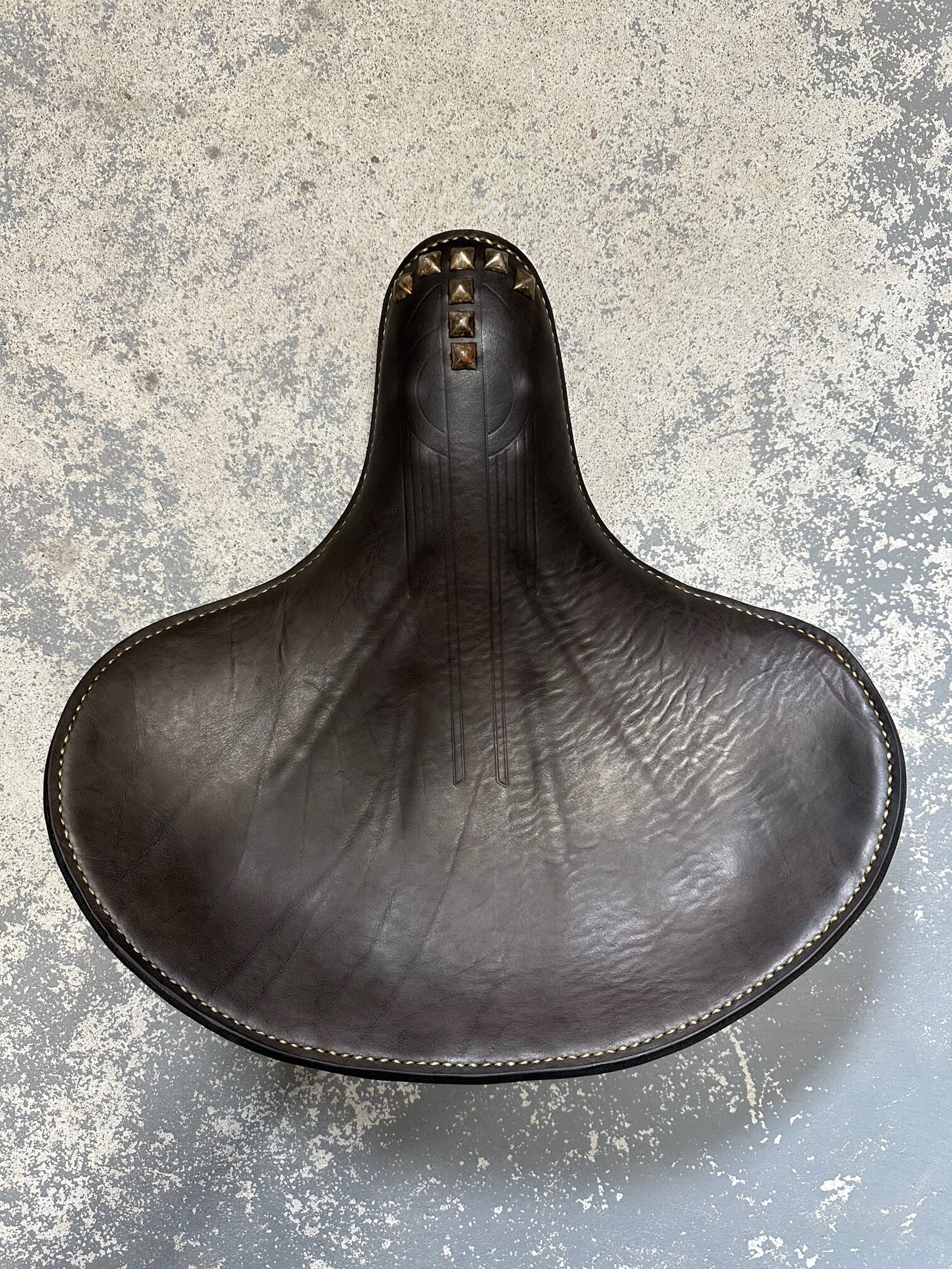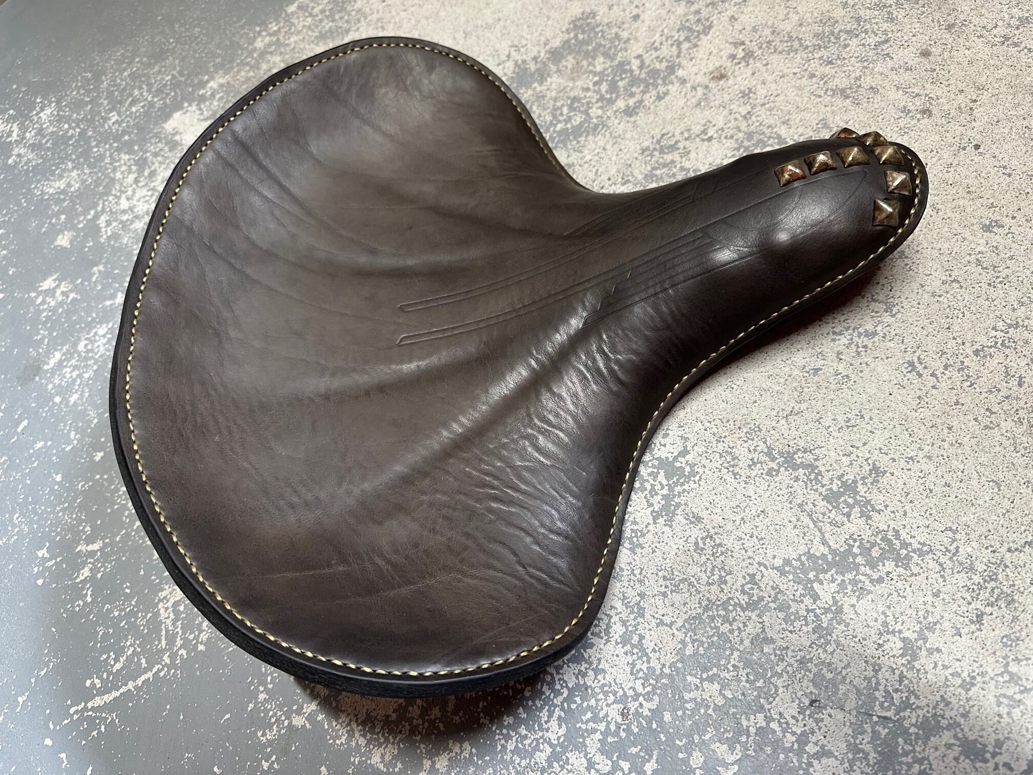 16oz、約5ミリ厚の墨色ヘビーデューティーレザーで製作した一点物です、ノーズにビンテージスタッズを奢りました、お早めにどうぞ。