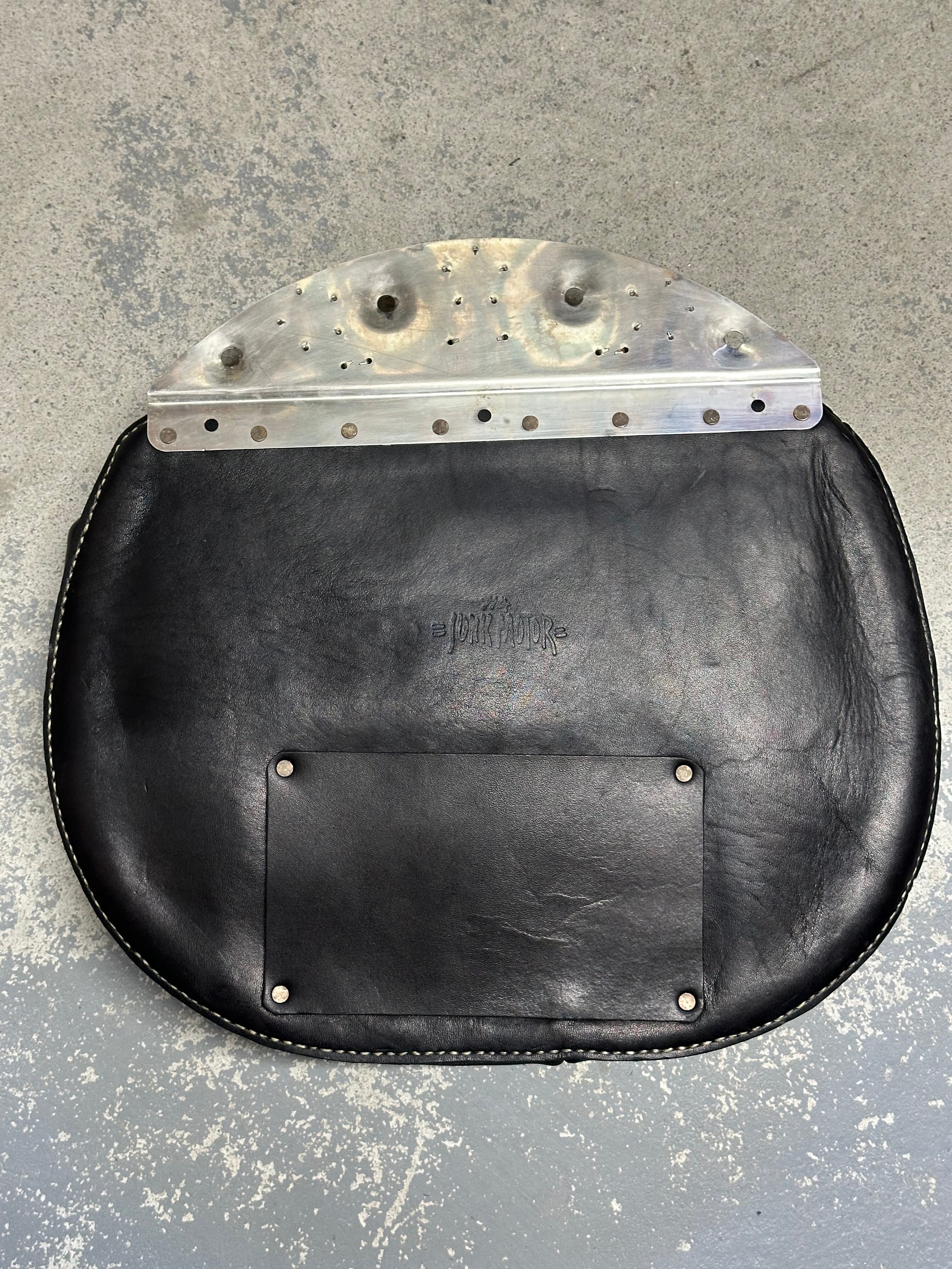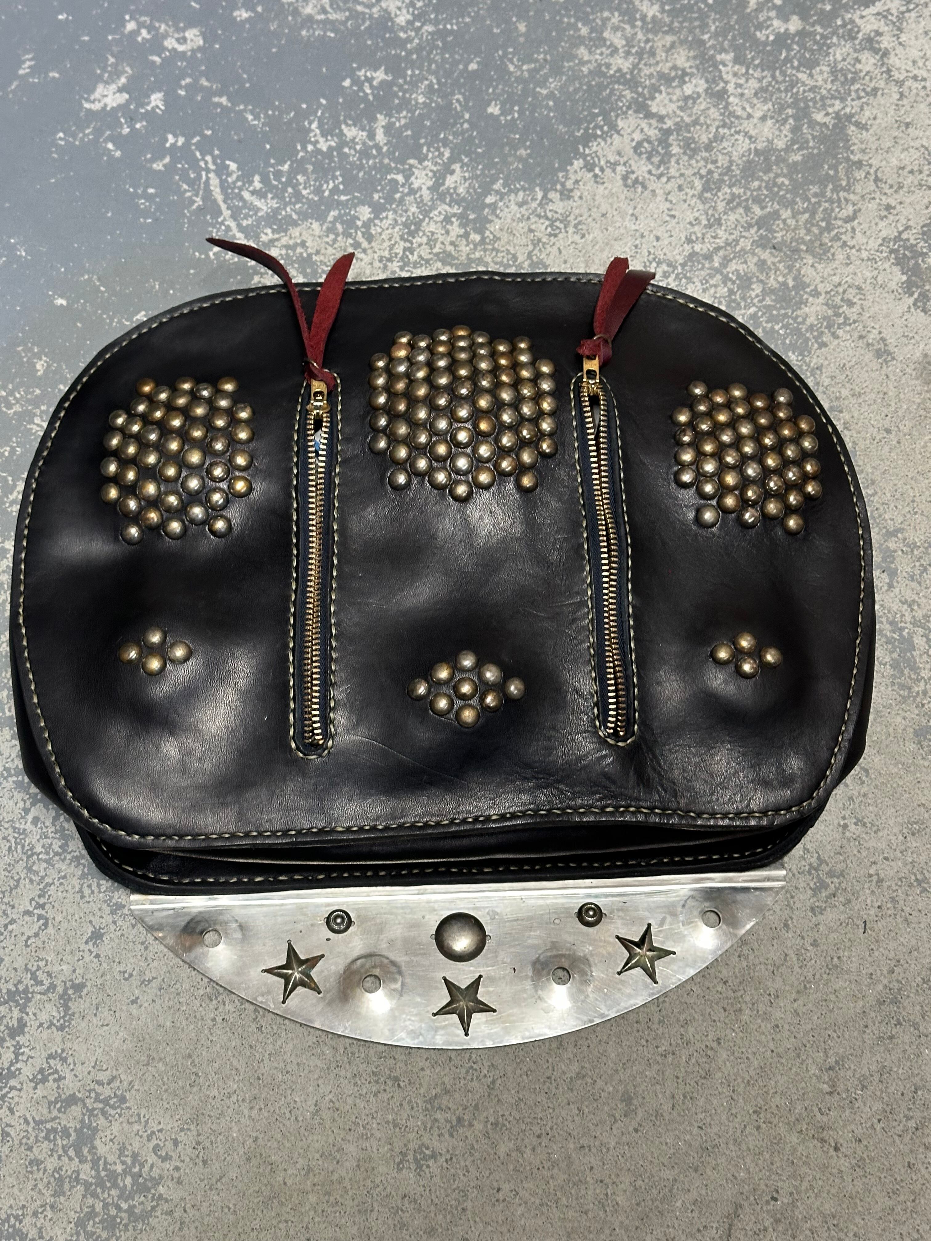 16ozのヘビーデューティーレザーを手縫い、ビンテージスタッズ、ビンテージファスナーを使い仕上げました、フラップを付けずエントリーはファスナーからのファスト仕様、こちらも一点モノの最新作です。